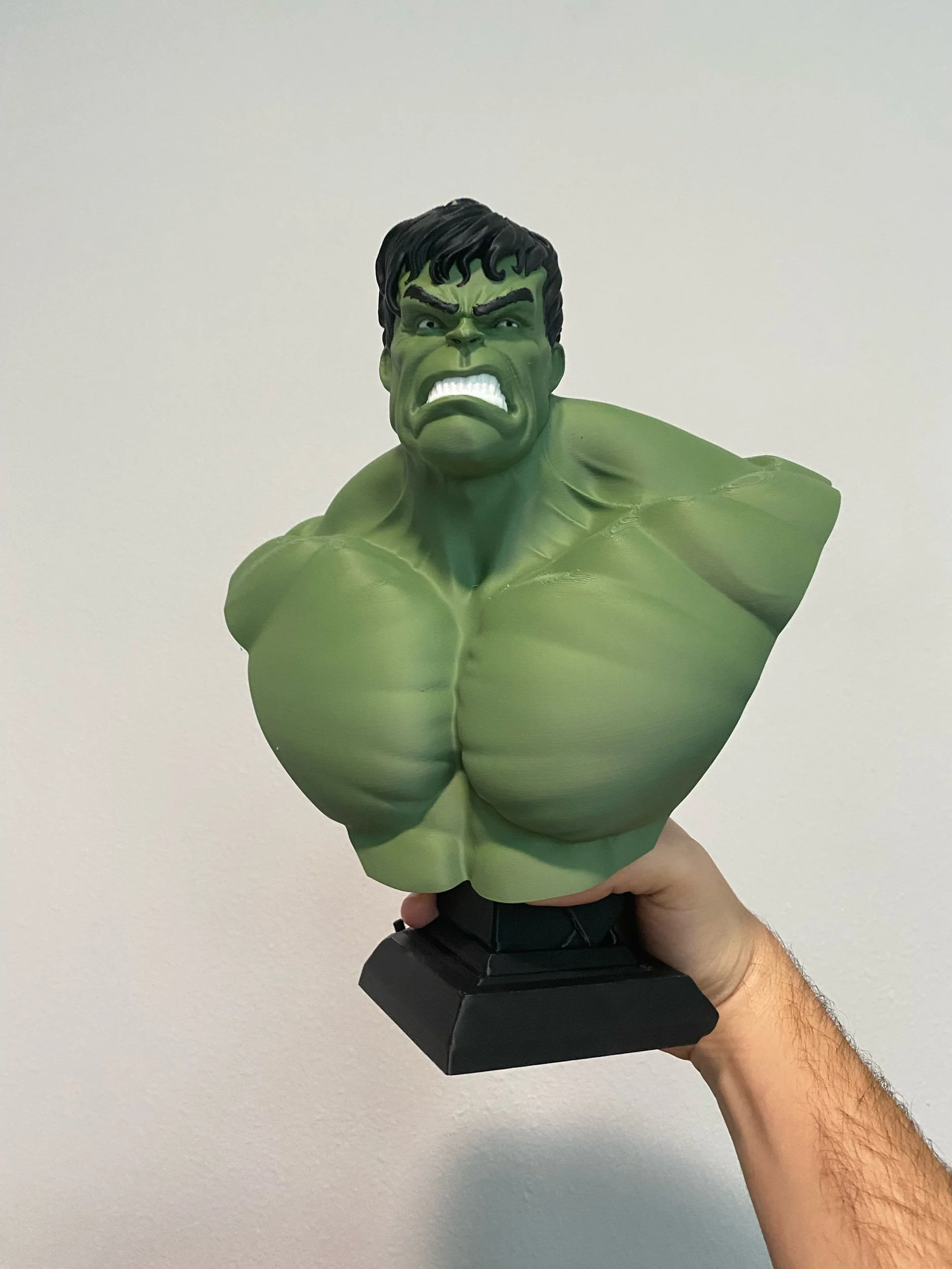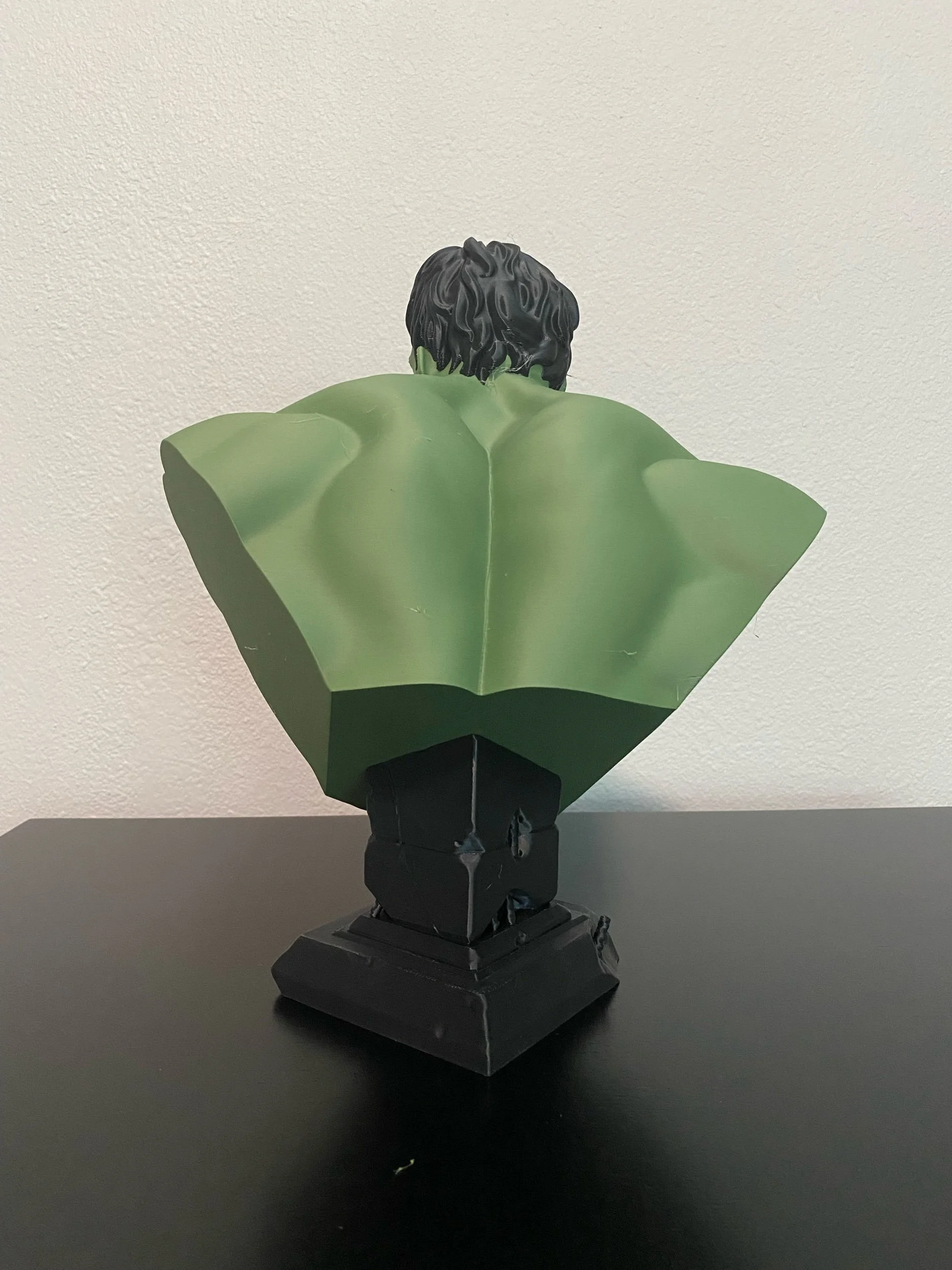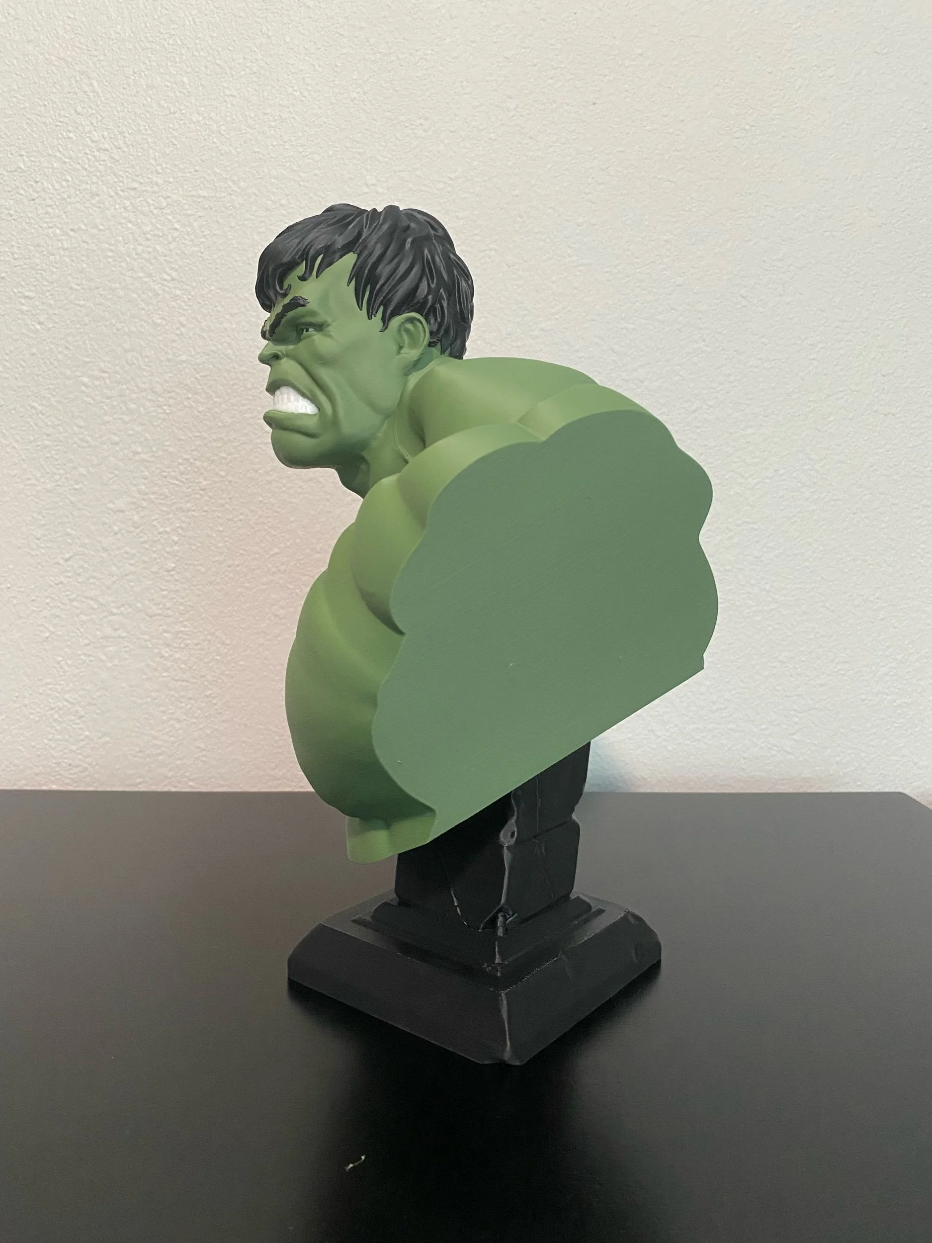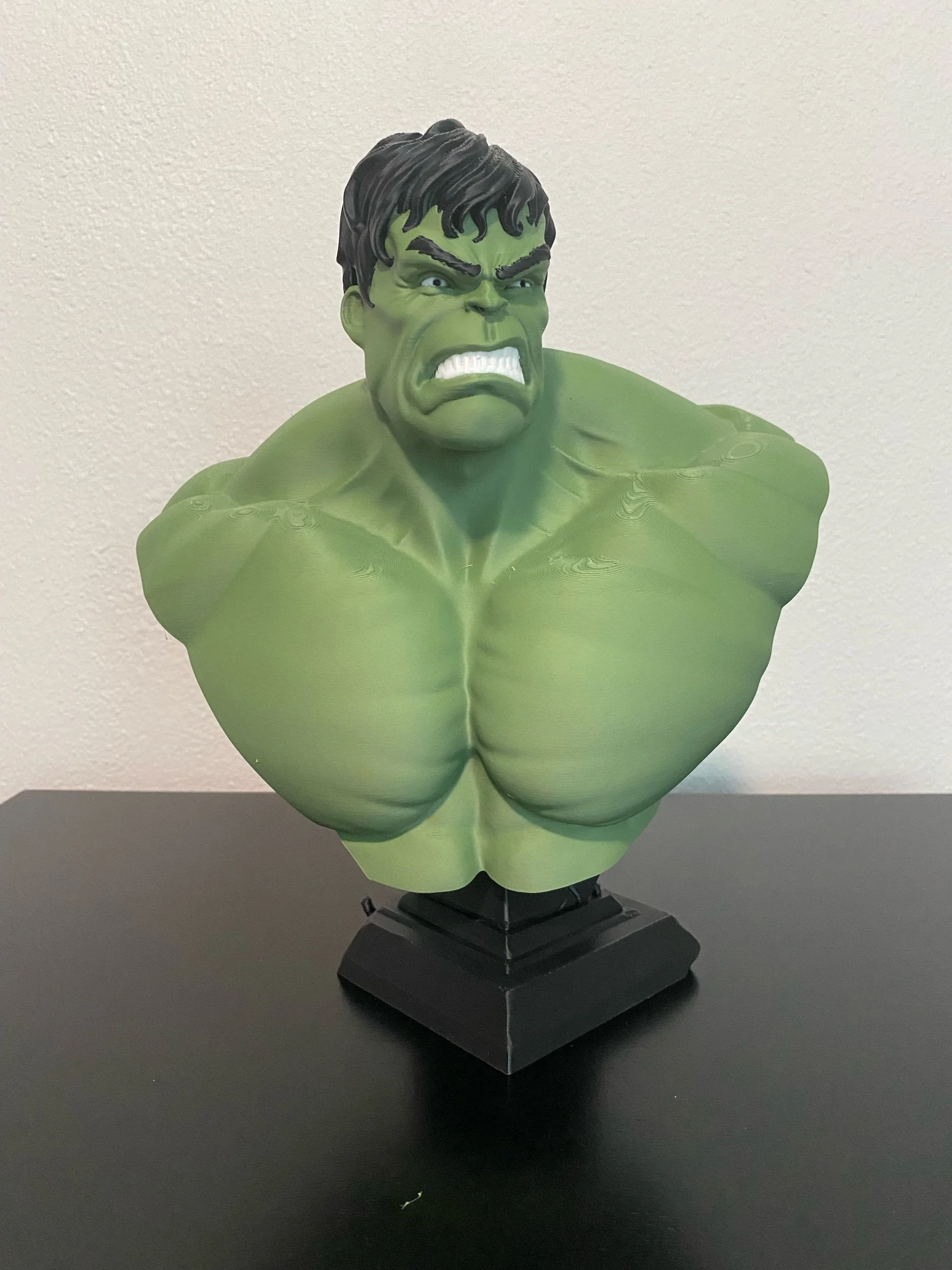 Check out this high quality 3D printed bust of the hulk! This bust is made on a multicolor 3D printer. It has amazing detail and a nice smooth finish. It stands on a base at 11” tall