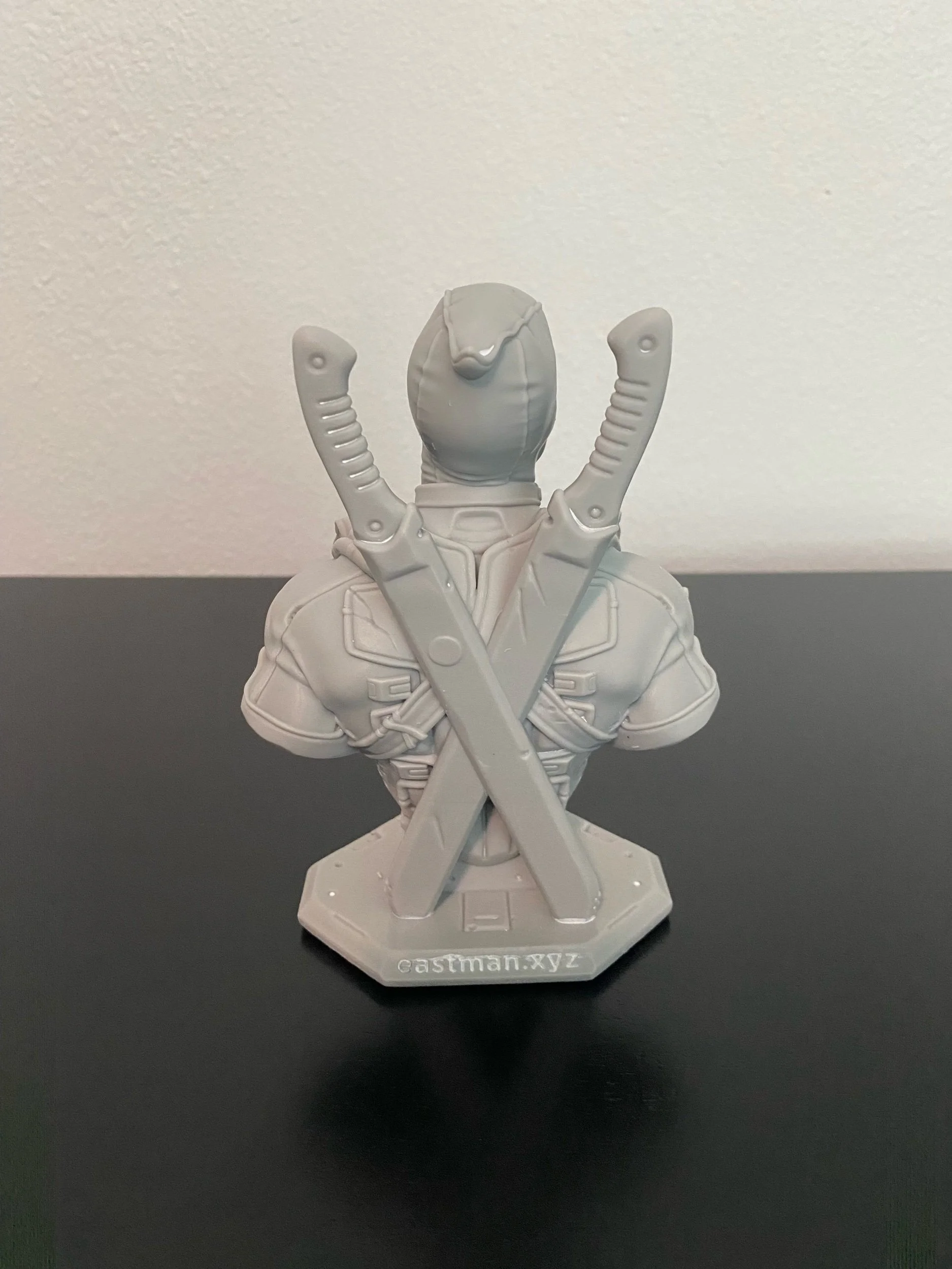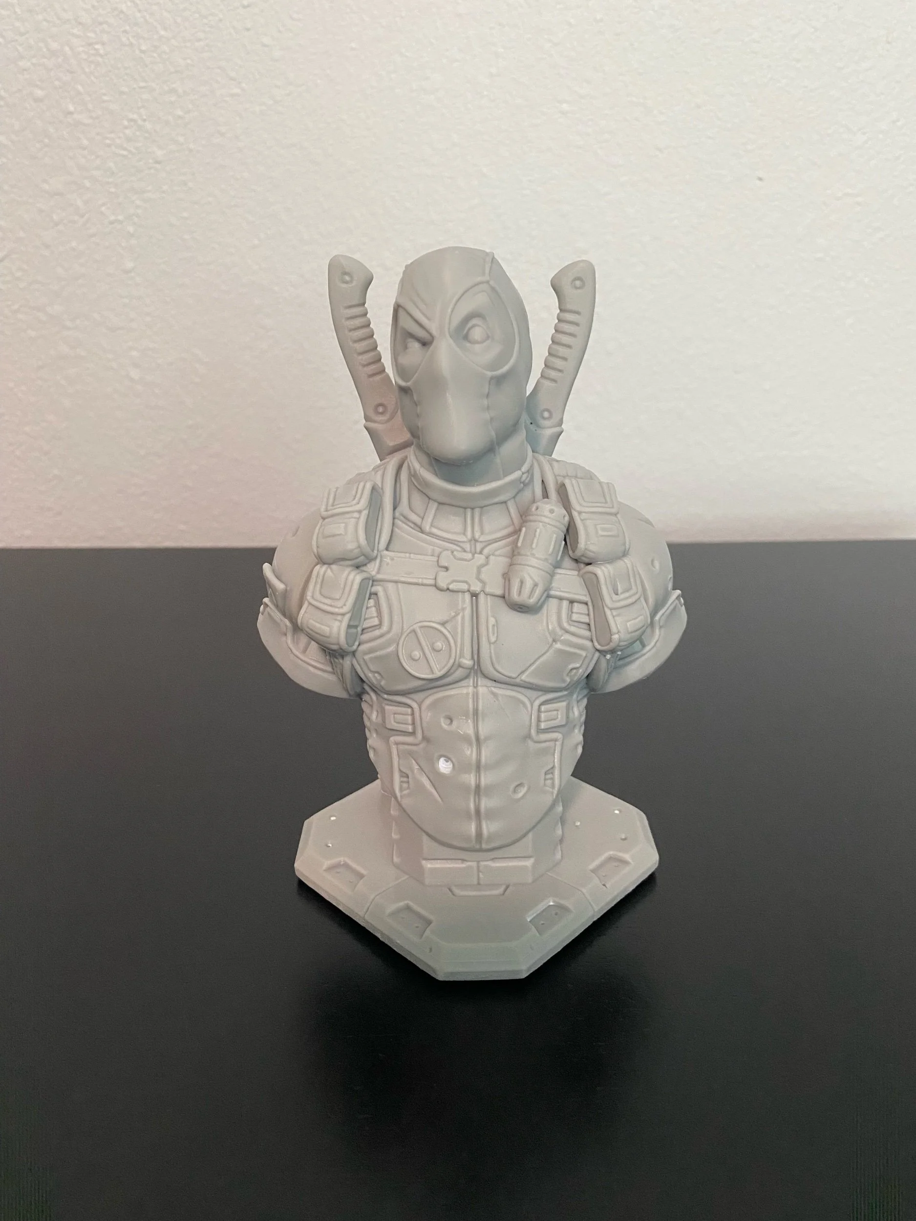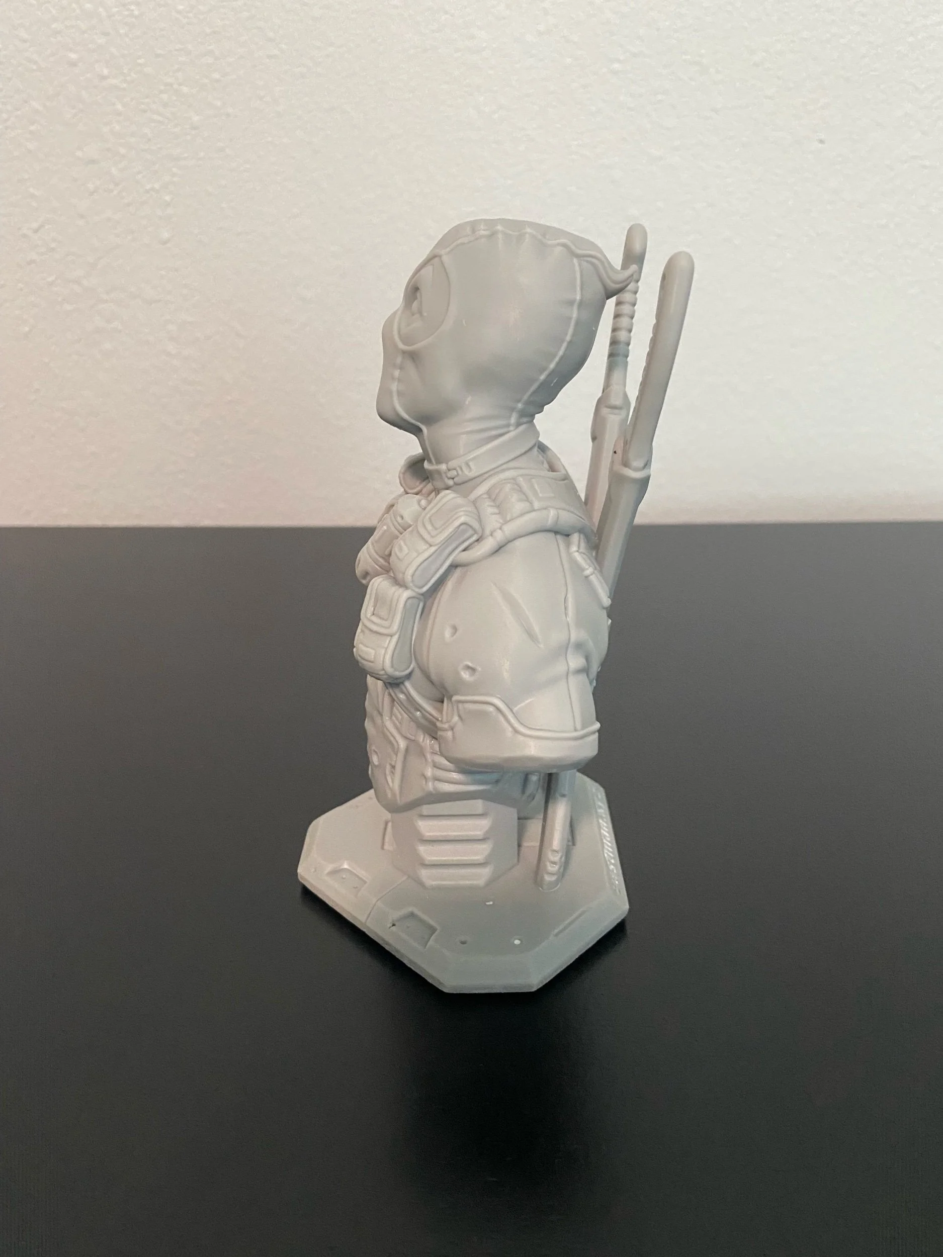 Check out this extremely high detailed resin printer bust of Deadpool! This is made on a high quality resin 3D printer. The figure shows great detail with a quality smooth finish.